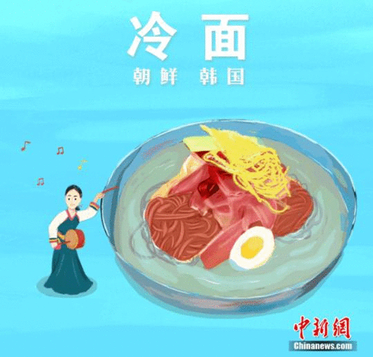 以精心熬制的牛肉高湯為湯底,蕎麥面煮熟放涼挽成一團(tuán),再在上面一層層鋪上蘿卜條泡菜、辣醬、牛肉片、雞蛋絲、雞肉絲等小菜,最重要的還要放幾片梨。