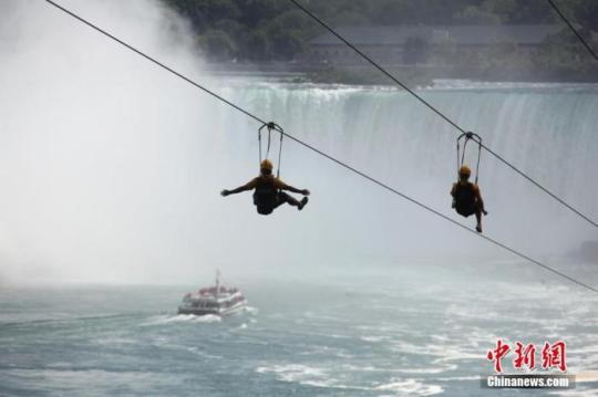 當?shù)貢r間7月29日,游客在加拿大、美國交界處的著名景點尼亞加拉大瀑布群加拿大一側(cè)體驗高空滑索。中新社記者 余瑞冬 攝