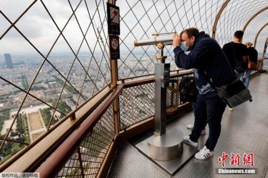 資料圖:當(dāng)?shù)貢r(shí)間7月15日,法國(guó)巴黎埃菲爾鐵塔頂層開放,一名男子通過望遠(yuǎn)鏡俯瞰巴黎。