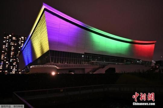 當(dāng)?shù)貢r間2020年7月23日,日本東京,東京奧運會倒計時一周年,東京奧運會比賽場館有明競技場亮起奧運五環(huán)色燈光。