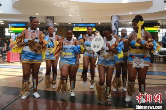 當地時間9月20日,搭乘國航航班的10名中國游客順利抵達南非城市約翰內斯堡。值得一提的是,這是中國自8月進一步恢復出境團隊旅游后,首批從北京出發(fā)抵達南非的中國旅行團。圖為當地民眾通過民族歌舞的方式歡迎中國游客的到來。記者 王曦 攝