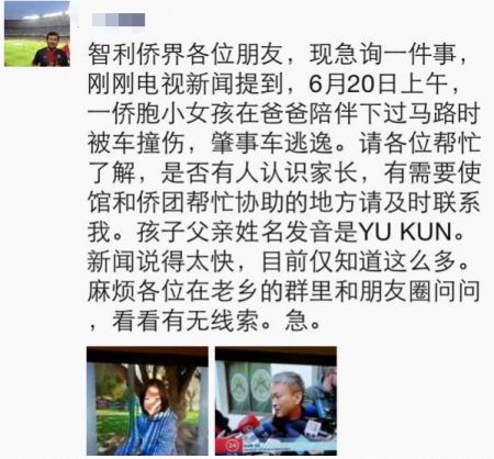 20日當(dāng)晚,中國駐智利大使館工作人員,在晚間電視新聞里看到一名僑胞小女孩被車撞傷,肇事車輛逃逸的新聞后,第一時(shí)間在他自己的朋友圈里發(fā)出緊急找人信息。不到兩分鐘就得到圈內(nèi)僑胞關(guān)注并回復(fù)告知是臺灣同胞。21日上午,在智京中華會館主席呂玉松的陪同下,中國駐智利使館代表趕赴德國醫(yī)院看望還在搶救中的小同胞以及家屬,并轉(zhuǎn)達(dá)李寶榮大使及智利僑界的關(guān)切與問候。