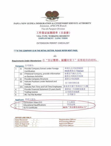 中國(guó)僑網(wǎng)9月7日電 據(jù)巴布亞新幾內(nèi)亞華助中心消息,當(dāng)?shù)貢r(shí)間6日,華助中心接到巴新移民局新規(guī)定,所有涉及到“零售業(yè)務(wù)”的公司,在目前暫緩、暫停簽證申請(qǐng)的情況下,延期簽證必須提供“英語(yǔ)雅思4分以上成績(jī)單”,學(xué)歷證明和詳細(xì)簡(jiǎn)歷。如果缺失上述材料,將導(dǎo)致拒簽。
