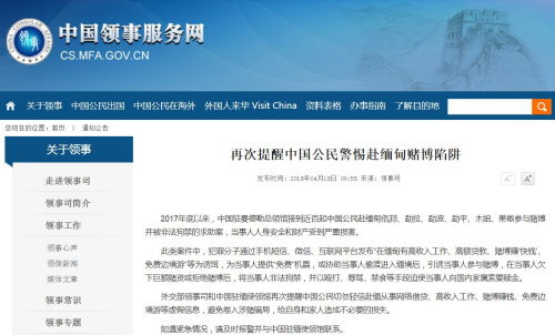 中國僑網(wǎng)4月18日電 據(jù)中國領(lǐng)事服務(wù)網(wǎng)消息,2017年底以來,中國駐曼德勒總領(lǐng)館接到近百起中國公民赴緬甸佤邦、勐拉、勐波、勐平、木姐、果敢參與賭博并被非法拘禁的求助案,當(dāng)事人人身安全和財產(chǎn)受到嚴(yán)重?fù)p害。