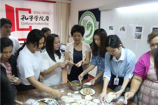 “包餃子——中國傳統(tǒng)美食體驗活動”是最引人矚目的一個。孔院教師一邊示范包餃子的要領,一邊教給大家包餃子的常用語,例如“搟皮兒”、“肉餡兒”、“搟面杖”、“面粉”等詞語,并解釋了喜慶節(jié)日吃餃子的中國習俗,還邀請大家“實戰(zhàn)演練”。在場民眾不僅品嘗到了中國的傳統(tǒng)美食、掌握了包餃子的方法,而且還在整個活動過程中享受到了中國傳統(tǒng)飲食文化帶給他們的樂趣。