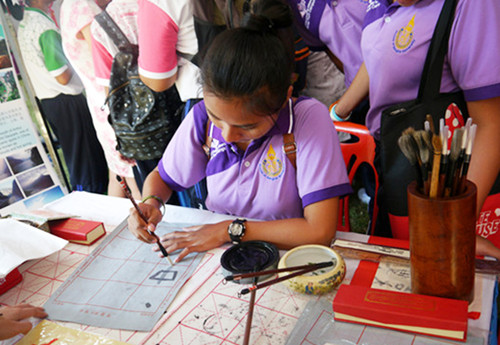 此次活動由中國文化展和中華民族服飾秀組成。其中,中國文化展包括中國結(jié)、中國書法、中國紙藝、漢語教材展示等,中國紙藝又分為中國剪紙、中國折紙、中國刻紙。鮮明的中國元素,引起了泰國師生的強(qiáng)烈興趣,他們紛紛駐足參與其中。