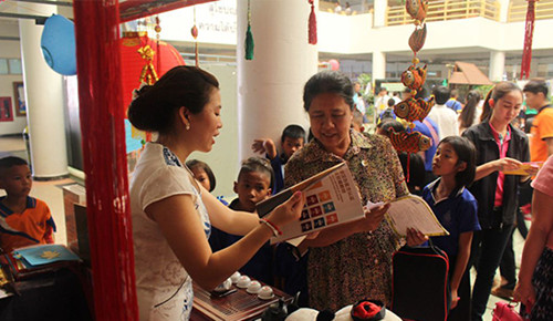 活動(dòng)首日,尖竹汶府副府尹Sommai Wichiancha來到孔院展區(qū)參觀,并與孔院教師親切交談。