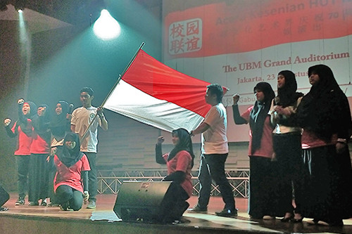 中國僑網8月31日電 據國家漢辦網站消息,“1945年那年,印度尼西亞獨立了。紅白旗,在全體印度尼西亞民族的心中飄揚……”近日,印尼阿拉扎大學孔子學院合唱團應邀參加首都文化藝術界慶祝建國70周年文藝演出,用漢語朗誦了詩歌《紅白旗,我民族的旗幟》,為印尼國慶獻禮。