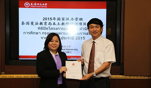 此次研修團的課程由曼松德孔子學院與天津師范大學共同商定,包括漢語本體知識、教學法、教學技能和HSK考試等課程,還有書法、剪紙、太極拳、京劇等文化方面的內(nèi)容。學習之余,天津師范大學還安排教師們參觀了北京故宮、長城等名勝古跡,以及天津古文化街和楊柳青鎮(zhèn),讓大家零距離接觸和體會中國文化。研修期間,曼谷市教育局局長李召龍(Mr. Jaroon Meerhanataworn)等高級教學督導(dǎo)組成的曼谷市教育局高訪團也來到天津師范大學,他們對本土教師的培訓(xùn)情況進行了解并參加了結(jié)業(yè)典禮。