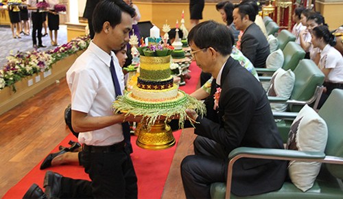 儀式上,蘇比巴府尹、瓦拉尼副校長(zhǎng)、川登喜皇家大學(xué)素攀分校校長(zhǎng)沃拉維和吳小馨院長(zhǎng)就坐于主席臺(tái)前排,接受學(xué)生的敬拜。學(xué)生們以院系為單位,輪流上臺(tái)跪拜每位教師,并獻(xiàn)上親手制作的花籃,教師們雙手合十,一一還禮。