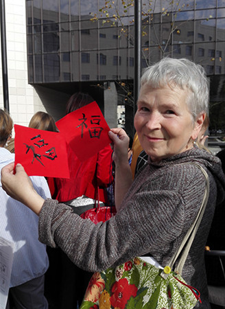 中國(guó)民間傳統(tǒng)工藝剪紙?bào)w驗(yàn)中,體驗(yàn)者疊紙、畫字型,然后親自剪出“喜”字和“春”字,并在字邊用花章蓋出不同的花樣;書法體驗(yàn)桌旁,參與者學(xué)習(xí)了漢字的基本筆畫,然后寫出自己的心愿,一幅幅“愛”“?!薄昂推健钡戎袊?guó)漢字躍然紙上;古老的中國(guó)結(jié)體驗(yàn)區(qū)也吸引許多參觀者圍觀,他們分別學(xué)會(huì)了編雙線結(jié)、紐扣結(jié)、盤長(zhǎng)結(jié),對(duì)中國(guó)結(jié)藝術(shù)表現(xiàn)出濃厚的興趣。