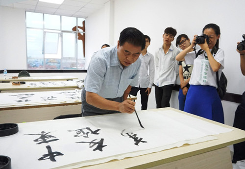 在舞蹈室,九江學(xué)院選派的漢語教師志愿者方茜在教學(xué)生跳新疆舞,看到家鄉(xiāng)的舞蹈,艾力更·依明巴海臉上露出開心的笑容。書畫室里,學(xué)生們一筆一劃地學(xué)寫中國字。受到這種濃厚書畫氛圍的感染,黃華華副主任即興揮毫潑墨寫下“中柬友誼萬歲”,博得現(xiàn)場陣陣掌聲。在武術(shù)室,孔子學(xué)院教師在教學(xué)生練太極拳,孔子學(xué)院學(xué)生王虎一首深情的《在那遙遠的地方》博得副委員長的高度贊賞。