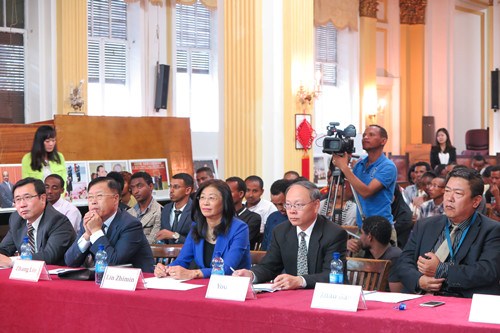 藺代辦在致辭中回顧了中非文化交流領(lǐng)域的發(fā)展成就,并表示今年是中非合作論壇成立15周年,在中非峰會召開前夕舉行“漢語橋-中非友誼知識競賽”對促進(jìn)中非人民交往、增進(jìn)中非友誼、培養(yǎng)和選拔優(yōu)秀漢語人才具有重要意義,期待競賽在埃塞掀起新一輪學(xué)習(xí)漢語、中國文化和中非知識的熱潮,帶動當(dāng)?shù)馗嗄贻p人成為傳播中非、中埃友誼的使者。