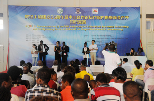 “慶祝中加建交55周年暨中非合作論壇約翰內(nèi)斯堡峰會召開知識競賽”分為預賽和決賽。預賽在加納大學孔子學院舉行,勝出的10名加納選手和10名中國選手組成10組中加聯(lián)合參賽隊參加決賽。10組選手在決賽中回答了關(guān)于中加兩國國情和中加政治、經(jīng)濟、文化、人文交往以及中非關(guān)系方面的問題,賽況精彩激烈,觀眾反響熱烈。孫大使和阿杰曼部長全程觀看了知識競賽,并為獲獎選手頒獎。
