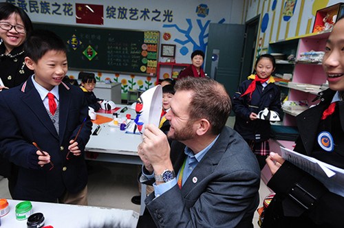 本次活動(dòng)中,20余名美國(guó)校長(zhǎng)觀摩了該校語(yǔ)文、數(shù)學(xué)、美術(shù)、音樂(lè)等課堂,體驗(yàn)了各種傳統(tǒng)藝術(shù)和體育活動(dòng),興致盎然地參與了繪畫、剪紙、書法、臉譜制作、舞蹈、合唱、抖空竹、踢毽子、推鐵環(huán)等豐富多彩的校園活動(dòng)。