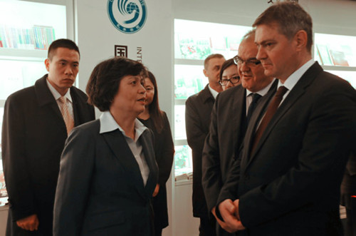 孔子學(xué)院總部總干事、國家漢辦主任許琳陪同茲維茲迪奇總理一行參觀了中華文化體驗中心、國際漢語教學(xué)資源展示區(qū),介紹了全球孔子學(xué)院發(fā)展情況。