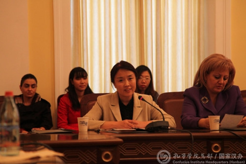 隨后,與會(huì)人員就亞美尼亞中小學(xué)漢語(yǔ)教學(xué)的前景問(wèn)題與合作方式進(jìn)行了深入探討。亞美尼亞中小學(xué)聯(lián)盟負(fù)責(zé)人姆拉江高度肯定了孔子學(xué)院與中小學(xué)聯(lián)盟的合作。多所中小學(xué)的校長(zhǎng)表示,將盡快申請(qǐng)開(kāi)設(shè)漢語(yǔ)課程,為自己學(xué)校的學(xué)生提供更好的發(fā)展機(jī)會(huì)。斯捷潘納凡市“圖馬尼揚(yáng)”學(xué)校校長(zhǎng)姆克爾江表示,在亞美尼亞推廣漢語(yǔ)就是在進(jìn)一步鞏固兩國(guó)友誼,如果世界上沒(méi)有友誼,就像沒(méi)有太陽(yáng)一樣暗無(wú)天日,她還在發(fā)言最后激動(dòng)地高呼“中-亞友誼萬(wàn)歲!”