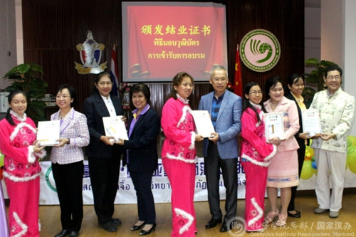 李召龍局長代表曼谷市教育局表達了對曼松德孔子學(xué)院的感謝,他表示,曼松德孔子學(xué)院是曼谷市教育局的長期合作伙伴,雙方保持了良好的合作關(guān)系??自号囵B(yǎng)出來的漢語教師已成為曼谷市教育局教學(xué)系統(tǒng)內(nèi)的中流砥柱,為泰國漢語教學(xué)的發(fā)展做出了巨大的貢獻。局長還為獲得“全勤獎”的學(xué)員頒發(fā)了榮譽證書,鼓勵他們繼續(xù)努力,認真參加曼松德孔子學(xué)院的培訓(xùn)。