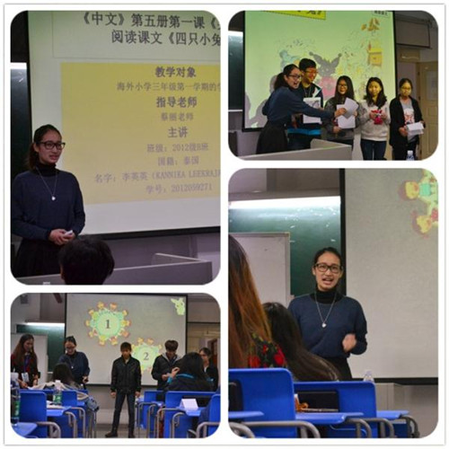 主題報告結(jié)束后,與會嘉賓移步華文學(xué)院第一教學(xué)樓,觀摩了“華文教育專業(yè)學(xué)生專業(yè)技能展示”。暨南大學(xué)華文學(xué)院華文教育系學(xué)生李英英和華文大學(xué)華文學(xué)院學(xué)生楊家憶分別展示了一段模擬課堂教學(xué)。李英英同學(xué)以泰國小學(xué)三年級母語非漢語學(xué)生為教學(xué)對象,進(jìn)行了一堂漢語閱讀課教學(xué),教態(tài)親切自然、教法靈活豐富,課堂氣氛活躍。楊家怡同學(xué)以漢語零基礎(chǔ)成人學(xué)生為教學(xué)對象,展示了一堂生詞教學(xué),教法深入淺出、教具精美實用。兩位學(xué)生的教學(xué)展示獲得與會專家的積極評價,暨南大學(xué)華文學(xué)院張軍教授、華僑大學(xué)華文學(xué)院副院長李善邦、云南師范大學(xué)云南華文學(xué)院常務(wù)副院長段潔云等與會嘉賓從各個角度全面、充分肯定了兩位學(xué)生在課堂教學(xué)中的優(yōu)點,對華文教育專業(yè)學(xué)生專業(yè)教學(xué)技能的訓(xùn)練效果給予了高度評價,同時也結(jié)合各自教學(xué)經(jīng)驗提出了建議。