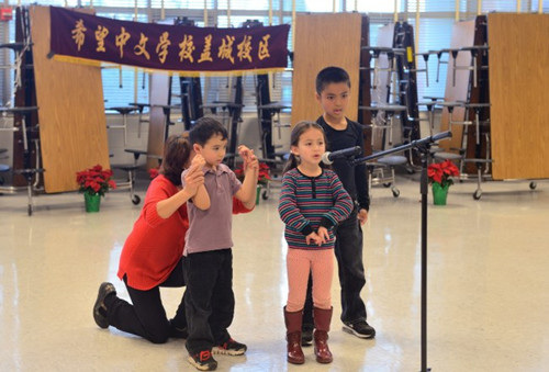 校長頒發(fā)獎金給今年中文SAT考取高分的學(xué)生,其中四人成績是800分。而剛學(xué)一學(xué)期漢語的雙語班學(xué)生,還一同演唱兒歌“兩只老虎”,博得現(xiàn)場熱烈掌聲,許多學(xué)生表演起來毫不怯場,臺風(fēng)穩(wěn)健,老師和家長更為孩子的學(xué)習(xí)成果感到驕傲。