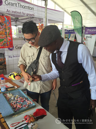 孔子學(xué)院展位以宣傳中國文化為特色,在眾多展位中獨樹一幟。對聯(lián)、燈籠、臉譜、中國結(jié)、扇子、掛畫等“中國風(fēng)”裝飾打造出濃厚的中國年味,吸引了眾多當?shù)孛癖姾驮诮蛉A人前來參觀??自航處熛虼蠹医榻B了由孔院出版的津巴布韋首部紹納語-漢語雙語詞典,引起當?shù)孛癖姷臐夂衽d趣。同時,孔子學(xué)院還設(shè)置了趣味橫生的游戲環(huán)節(jié),現(xiàn)場觀眾興致勃勃的參與其中。