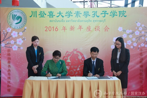 中國僑網(wǎng)1月27日電 據(jù)國家漢辦網(wǎng)站消息,日前,泰國川登喜大學(xué)素攀孔子學(xué)院舉辦2016年新年座談會暨簽約儀式,來自泰國各地區(qū)的45所合作學(xué)校及教學(xué)點的近百名代表參加了會議。