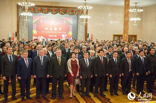 當?shù)貢r間2月3日晚,中國駐俄羅斯使館大宴會廳張燈結(jié)彩,為俄漢學家舉行了2016年新春招待會。中國駐俄大使李輝、俄外交部一亞局局長庫利克及俄科學院遠東所代所長盧佳寧出席并致辭。俄國家杜馬、聯(lián)邦委員會、外交部、俄中友協(xié)、俄科學院及俄科技、教育、文化等學術(shù)機構(gòu)和高等院校漢學家,與中國長期合作的公司以及地方漢學家代表、中俄媒體、使館外交官等700余人出席。