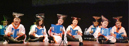 迷你話劇《西游記》為觀眾講述了唐僧收徒的故事,孩子們把孫悟空、豬八戒、沙僧和唐僧演的活靈活現(xiàn),看得臺下觀眾目不轉(zhuǎn)睛。值得一提的是,孔子學院教師李秋楊博士與學生合作帶來的散文《春》配樂朗誦與書法表演,李老師現(xiàn)場書寫《顏氏家訓-勉學篇》中的字句,講解了“春華秋實”的學習意義,贏得掌聲陣陣。