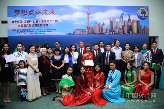 中國(guó)經(jīng)濟(jì)網(wǎng)4月25日塔什干訊(記者李遙遠(yuǎn)) 4月24日,由中國(guó)駐烏茲別克斯坦大使館主辦的第十五屆“漢語橋”世界大學(xué)生中文比賽烏茲別克斯坦賽區(qū)預(yù)選賽在烏國(guó)立世界語言大學(xué)禮堂舉行。8名來自烏國(guó)立世界語言大學(xué)、塔什干國(guó)立東方學(xué)院、撒馬爾罕國(guó)立外國(guó)語學(xué)院和費(fèi)爾干納大學(xué)的優(yōu)秀選手入圍最終角逐。中國(guó)駐烏茲別克斯坦大使孫立杰、烏國(guó)立世界語言大學(xué)校長(zhǎng)卡尤莫夫、塔什干孔子學(xué)院中烏方院長(zhǎng)及來自烏相關(guān)高校的師生代表約300人出席。