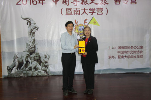 中國僑網4月26日電 據中國華文教育網站消息,日前,2016年海外華裔青少年“中國尋根之旅”春令營(暨南大學營)閉營儀式暨匯報演出在暨南大學華文學院隆重舉行。暨南大學華文學院黨委副書記史學浩,泰國華文教師公會和泰中華文教育基金會11位領隊老師出席閉營典禮。
