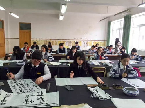 在安陽實驗中學校溢滿墨香的書法教室里,掛滿了學校書法社團學生精心準備的“禮物”,一張張筆酣墨飽的書法作品,書寫著不同的字體,傳遞著美好的情感。安陽實驗中學校林映老師為12位韓國學生上了一堂的書法課,介紹“文房四寶”,演示如何執(zhí)筆、運筆,并特意教韓國學生用行書體書寫“廣英”二字,讓韓國學生切身感受中華傳統文化的魅力。