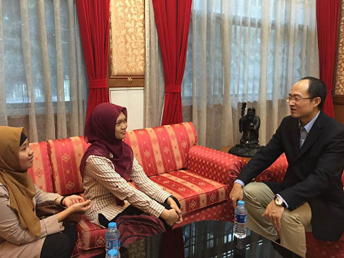 中國僑網(wǎng)5月17日電 據(jù)中國駐印尼大使館網(wǎng)站消息,近日,中國駐印尼政務(wù)參贊徐航天在使館會見即將赴華參加“新漢語”教學(xué)法培訓(xùn)班的日惹卡查瑪達大學(xué)中文系主任胡愛莉和教師許敏思,為二人送行。