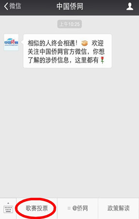 在會(huì)話界面底部的自定義菜單中點(diǎn)擊“歌賽投票”即可進(jìn)入投票頁(yè)面。