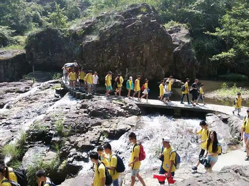 游覽的過程中,孩子們看到百丈一漈從207米高的巖壁上直瀉而下,猛烈地擊打著擋住它的巖石,像一條白練懸掛在空中,情不自禁地吟誦起中文老師教的古詩:“飛流直下三千尺,疑是銀河落九天?!眮淼蕉T,如夢如幻的水簾洞讓孩子們不時發(fā)出由衷的贊嘆,只有七歲的毅杰小朋友還天真地問老師:“這里會不會就是孫悟空住的水簾洞呢?”在場的老師同學都被他的天真可愛逗樂了。