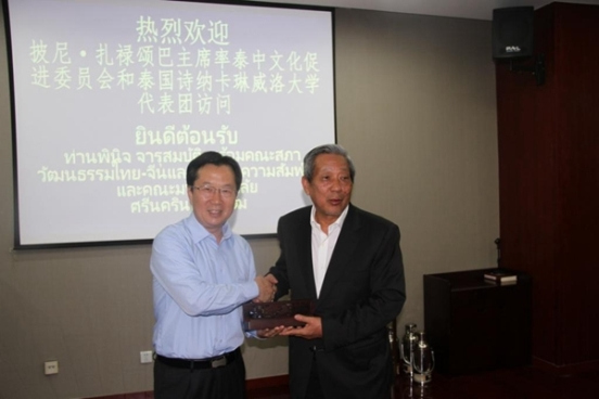 中國(guó)僑網(wǎng)8月9日電 據(jù)中國(guó)華文教育網(wǎng)消息,8月5日下午,由泰國(guó)著名政治家、華人領(lǐng)袖披尼•扎祿頌巴主席率領(lǐng)的泰中文化促進(jìn)委員會(huì)暨泰國(guó)詩(shī)納卡琳威洛大學(xué)代表團(tuán)訪問(wèn)北京華文學(xué)院。披尼主席一行25人與周虹院長(zhǎng)等人,以及十幾位在讀的泰國(guó)學(xué)生代表進(jìn)行了親切會(huì)談。