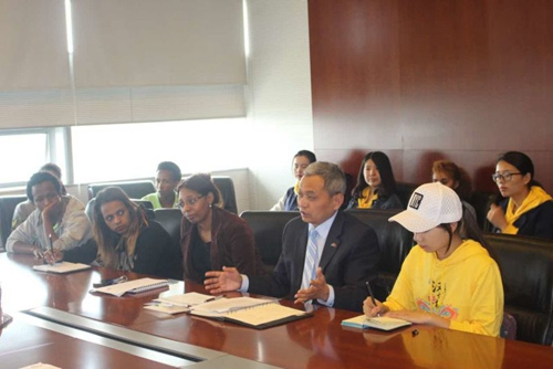 北京大學(xué)、中國人民大學(xué)和北京語言大學(xué)等14所高校的19名對(duì)外漢語專業(yè)大學(xué)生,和埃塞俄比亞亞的斯亞貝巴大學(xué)孔子學(xué)院的8名漢語專業(yè)大學(xué)生,共同參觀了非盟總部會(huì)議中心,并舉行聯(lián)合座談。