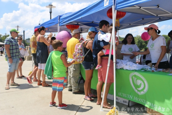 在賽區(qū)廣場搭建的富有中國特色的帳篷內(nèi),孔子學院全員出動,熱情地向廣大市民發(fā)放中文教學項目宣傳資料和文化活動宣傳畫冊,印有孔子學院標識的文化衫及小禮品尤其受到市民們的喜愛。他們紛紛留下聯(lián)系方式,表示愿意參加孔院舉辦的中文項目和文化活動。