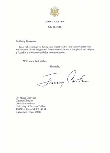 中國僑網(wǎng)9月19日電 據(jù)國家漢辦網(wǎng)站消息,日前,美國第39任總統(tǒng)吉米·卡特,分別向中國駐休斯敦總領館和德克薩斯大學達拉斯分??鬃訉W院致函,向該孔院原中方院長張乾元教授為其贈送水墨肖像畫表示感謝,并隨附兩份簽名合影照片。
