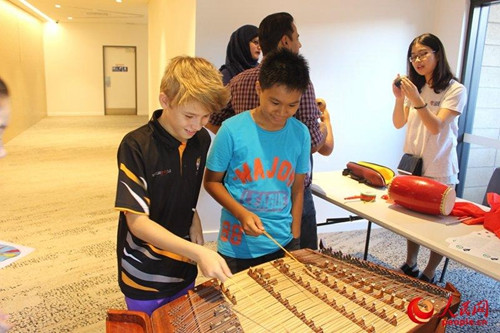 當(dāng)?shù)貎和w驗中國傳統(tǒng)樂器(照片由查爾斯·達(dá)爾文大學(xué)孔子學(xué)院提供)