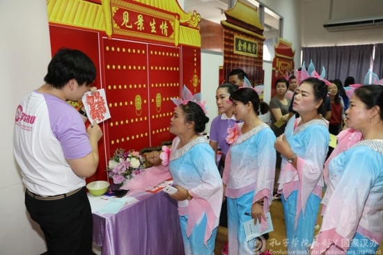 “文房四寶”景區(qū)讓本土教師們仿佛又回到了中國書法課堂上。有的教師拿起毛筆在宣紙上寫下了“孔子學院生日快樂”,祝??鬃訉W院日。
