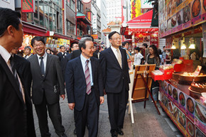 在南京町中華街,程大使走訪多家華僑店鋪,看望多年來(lái)一直在南京町執(zhí)業(yè)營(yíng)商的華僑,鼓勵(lì)他們繼承神戶華僑的優(yōu)良傳統(tǒng),繼續(xù)弘揚(yáng)中華傳統(tǒng)文化,促進(jìn)中日民間友好往來(lái)。