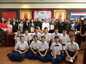 任總領(lǐng)事與薩達校長共同見證清邁大學(xué)孔子學(xué)院與蒙福學(xué)校合作協(xié)議的簽署并為孔子課堂揭牌。儀式后,任總領(lǐng)事與在場嘉賓一道參觀了孔子課堂的文化活動室,欣賞泰國學(xué)生們的中國茶道、書法、剪紙、民族樂器演奏等中華才藝表演。(駐清邁總領(lǐng)館供稿)