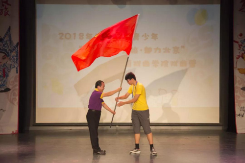 發(fā)言結(jié)束后,北京市人民政府僑務(wù)辦公室副主任史立臣向同源中文學(xué)校鮮雅康授予營(yíng)旗,隨著營(yíng)旗的成功授予,2018年“中國(guó)尋根之旅·魅力北京”戲曲營(yíng)開營(yíng)儀式圓滿結(jié)束。隨后,領(lǐng)導(dǎo)、領(lǐng)隊(duì)、授課教師及志愿者團(tuán)隊(duì)集體合影留念。