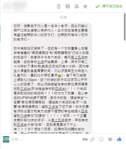他心疼地指出,自己的妻子(華小老師)也不好過,孩子清晨5時起床,家長必須更早,到校后展開一連串工作,也被逼迫教六年級課后輔導(dǎo)班和“加強班”。