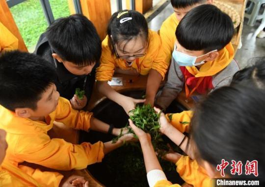 圖為青少年展示從茶山采集的新鮮茶葉。周毅 攝