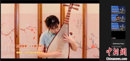 圖為中國學(xué)生在線上展示樂器琵琶(截屏圖)。川外中國語言文化學(xué)院供圖