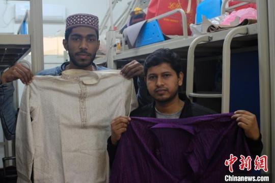 圖為兩名孟加拉國籍留學生正在展示自己的傳統(tǒng)服飾?!⒖÷?攝