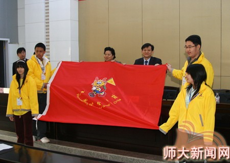 儀式上,陽(yáng)春娥和湖南師范大學(xué)副校長(zhǎng)蔣洪新親手將營(yíng)旗授給冬令營(yíng)。