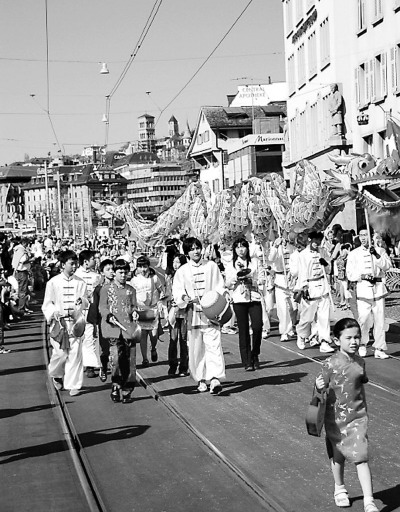 學(xué)校還積極鼓勵孩子們參與當(dāng)?shù)厣鐓^(qū)活動。比如,蘇黎世每年一次的送冬節(jié),就為我們提供了一個很好地向歐洲乃至世界展示中國文化的契機(jī)。以蘇黎世標(biāo)準(zhǔn)中文學(xué)校為主的兒童方隊,連續(xù)5年參加了這一當(dāng)?shù)厝嗣褶o舊迎新的盛大游行活動。孩子們身穿獨(dú)特的中國民族服裝,手拿精巧的工藝品,敲打著中國鑼鼓,把中國龍也舞上了蘇黎世的街頭,在蘇黎世市民尤其是兒童中引起了極大的轟動,當(dāng)?shù)孛襟w和瑞士電視臺都陸續(xù)報道了我們的方隊。