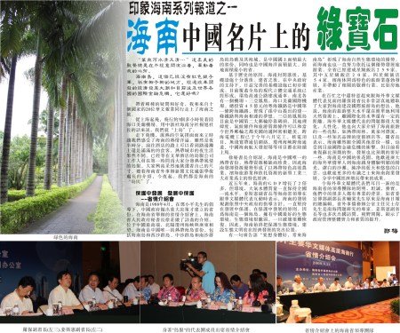 回到芝加哥后,我寫了四篇印象海南的系列報(bào)道,陸續(xù)在神州時(shí)報(bào)上以彩色半版的篇幅發(fā)表。有趣的是,多少年之后的某一天,我們報(bào)社的一個(gè)員工在微信圈里聊天時(shí)說起他是《神州時(shí)報(bào)》的記者,竟然有人把下面這個(gè)圖片發(fā)上來問,就是發(fā)這篇文章的《神州時(shí)報(bào)》吧?